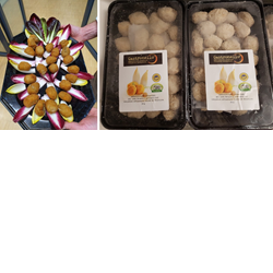 Discarded endive heads were used as a high value base ingredient for endive croquettes. This case focused on the valorisation of Belgian endive heads and leaves that were discarded for aesthetic reasons during the final post-harvest quality control and selection. These endives were deemed unfit for direct sale because they are either too small or slightly deformed. In terms of product quality they are however equivalent to the first class fresh market endives that are sold to the general public. The aim of this case was to develop a continuous production process (simulating a large scale industrial production process) rather than a batch by batch procedure. At the time that this product was developed, no commercial pressing company was available or had the proper equipment to perform the pressing of the endives to obtain a fraction of juice and a fibre rich press cake. ILVO provided support to the grower and producer by making its infrastructure available at the ILVO Food Pilot (http:\/\/www.foodpilot.be\/), with permission from the Belgian Food safety agency (FAVV) to produce food-safe batches to make the croquettes. Initially the raw product needed to be cleaned to avoid that debris and remains of earth end up in the press and contaminate the end-product. Since the endives were produced using the traditional method (cultivated in soil, rather than aquaponics), they often still contain some remains of dirt and sand, and must be thoroughly washed\/cleaned prior to processing. To achieve this the endives were briefly sprayed with water in a tub, the excess water was then drained and removed, after which the endives were cut in smaller pieces. Washing whole endive heads has proven problematic because large amounts of water remained inside the endives. This washing step was significantly improved by cutting the endive heads in half (longitudinally) prior to washing. This manual step was however more time consuming and labour intensive, particularly for larger batches. After cleaning, the endive heads and leaves were cut and transported to a vacuum press (VaculIQ®) to obtain two fractions, a liquid juice fraction and a fibre-rich press cake. From these processed materials the company Gastronello created the Belgian endive croquettes according to their recipe.
