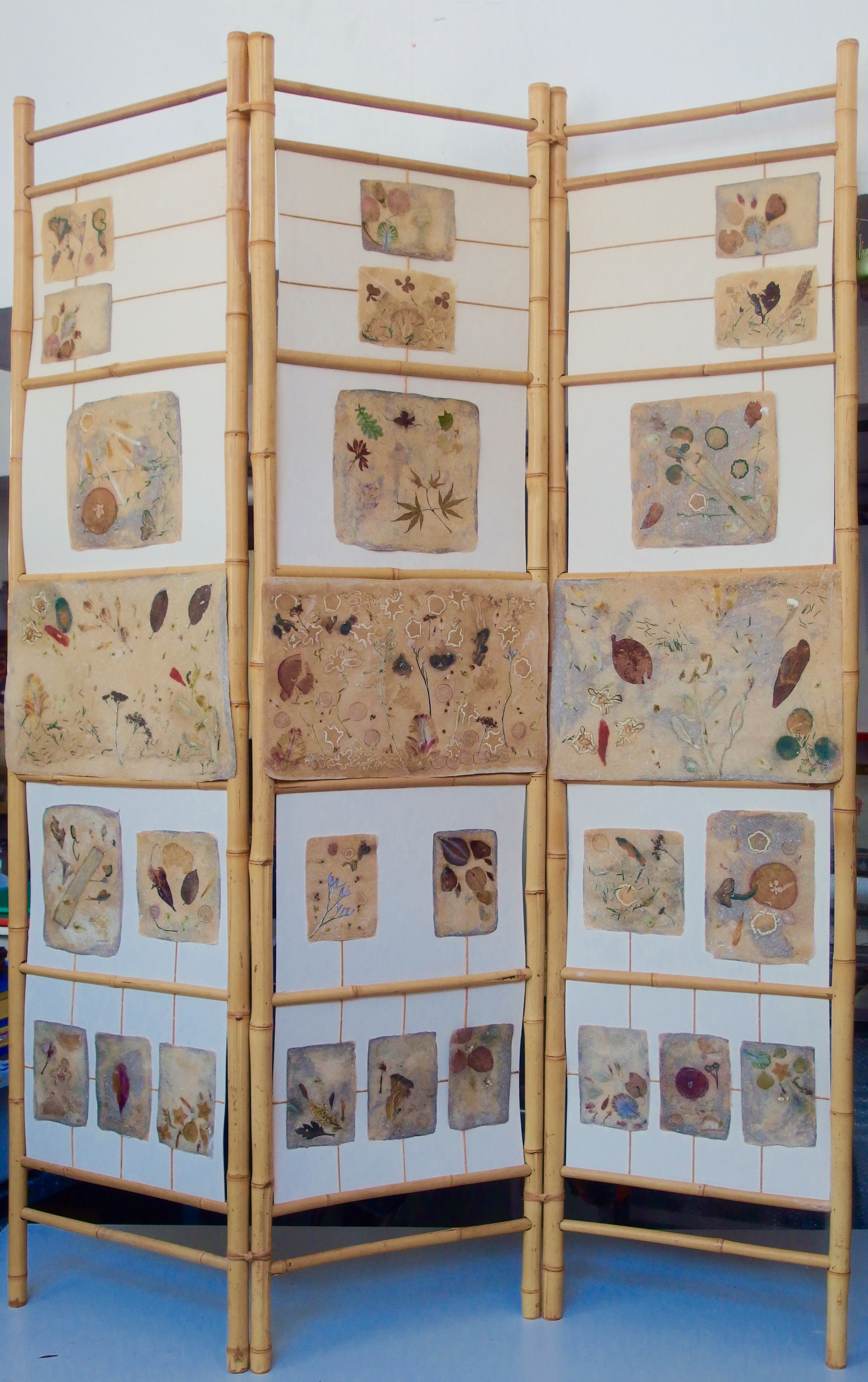 Prototype van een kamerscherm gemaakt van gedroogde bloemen en de resten van groenten zijn ingelegd in asperge karton.