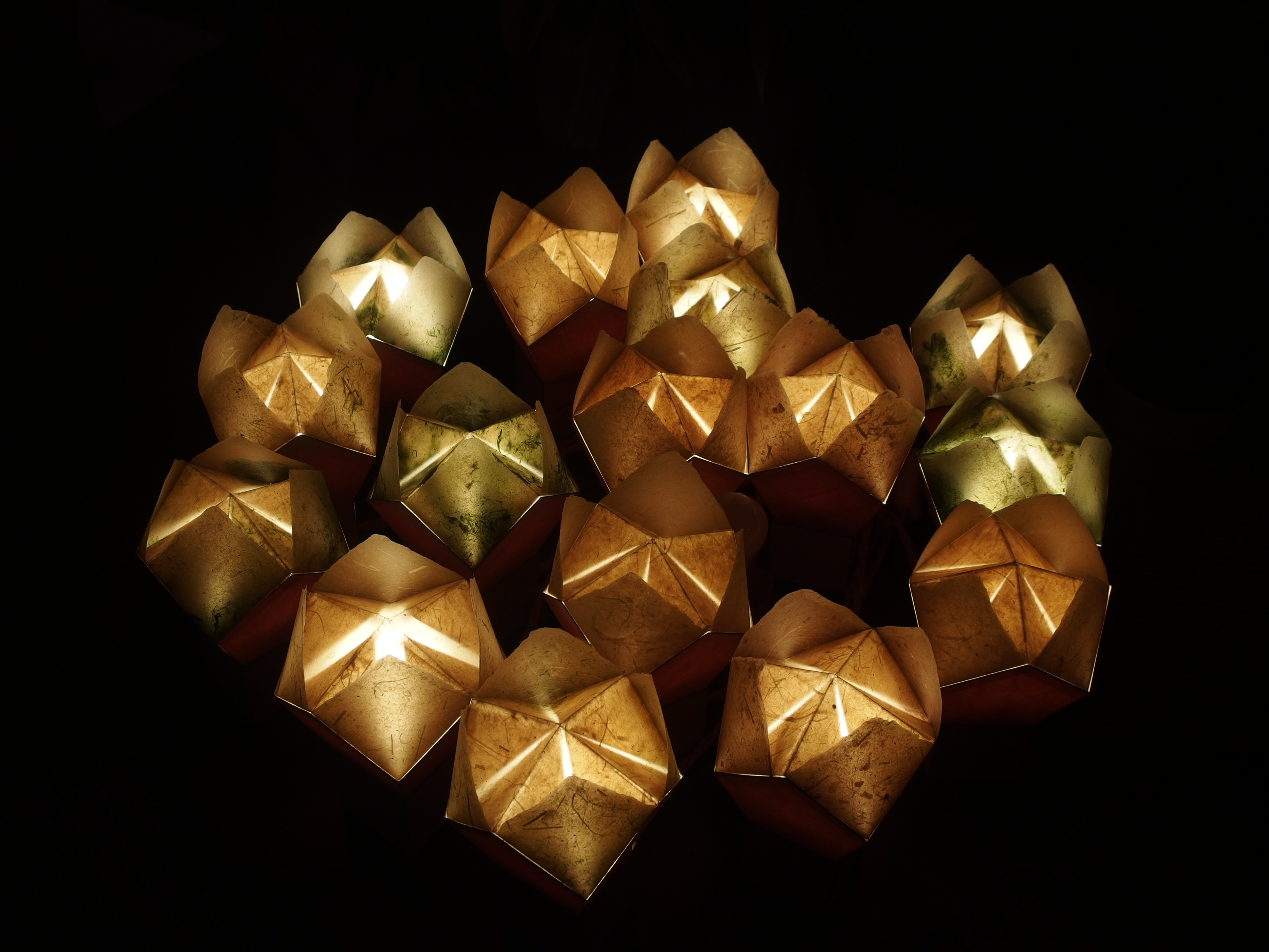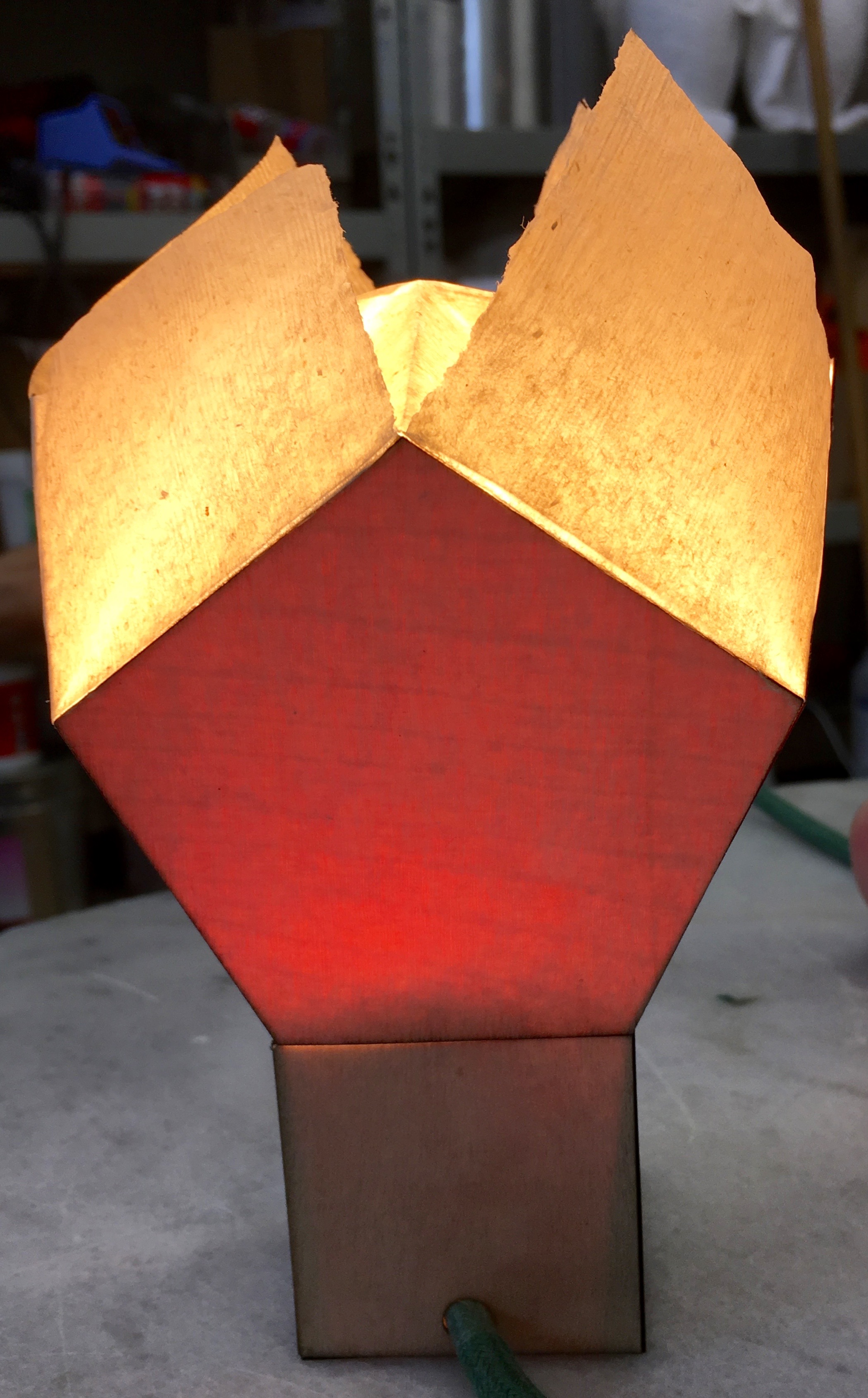 De lamp is gemaakt van een vierkant stuk aspergepapier dat in het kinderspelletje van peper en zoutvaatje is gevouwen. De papieren zijn allemaal individueel gemaakt. Je ziet de schepranden er nog aanzitten het begin en einde van een vel papier. Sommige hebben andere plantvezels erin zitten voor decoratie, andere niet. Het led licht zorgt ervoor dat het papier niet te warm wordt. Het geeft een warm licht door het aspergepapier.