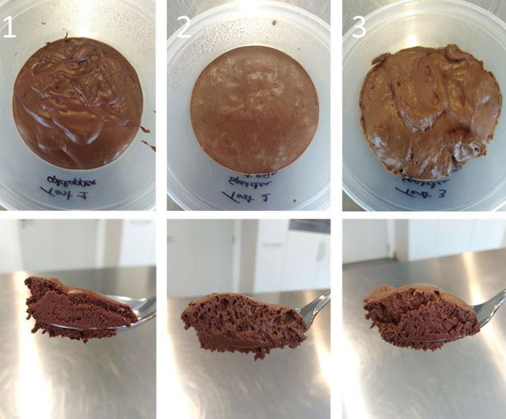 Recept 1: pure chocolade (70%), aquafaba (van kikkererwten uit blik), agavesiroop. Recept 2: pure chocolade (70%), aquafaba (van kikkererwten uit blik), agavesiroop, ciderazijn. Recept 3: pure chocolade (70%), aquafaba (van kikkererwten uit blik), kokosmelk (boter), kristalsuiker.