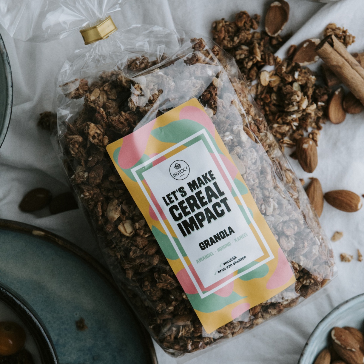 Tijdens het maken van hun bieren sprak Instock met hun brouwer over bierbostel. Dit is het voedzame moutresidu dat overblijft na het brouwen van bier. Samen met de Ribbink-bakkerij werd Instock Granola ontwikkeld en verkrijgbaar in twee smaken: amandel, honing, kaneel en kokosnoot, chocolade en noten. Laten we samen impact op granen maken! De granola is te koop bij Albert Heijn supermarkten en de restaurants van Instock.