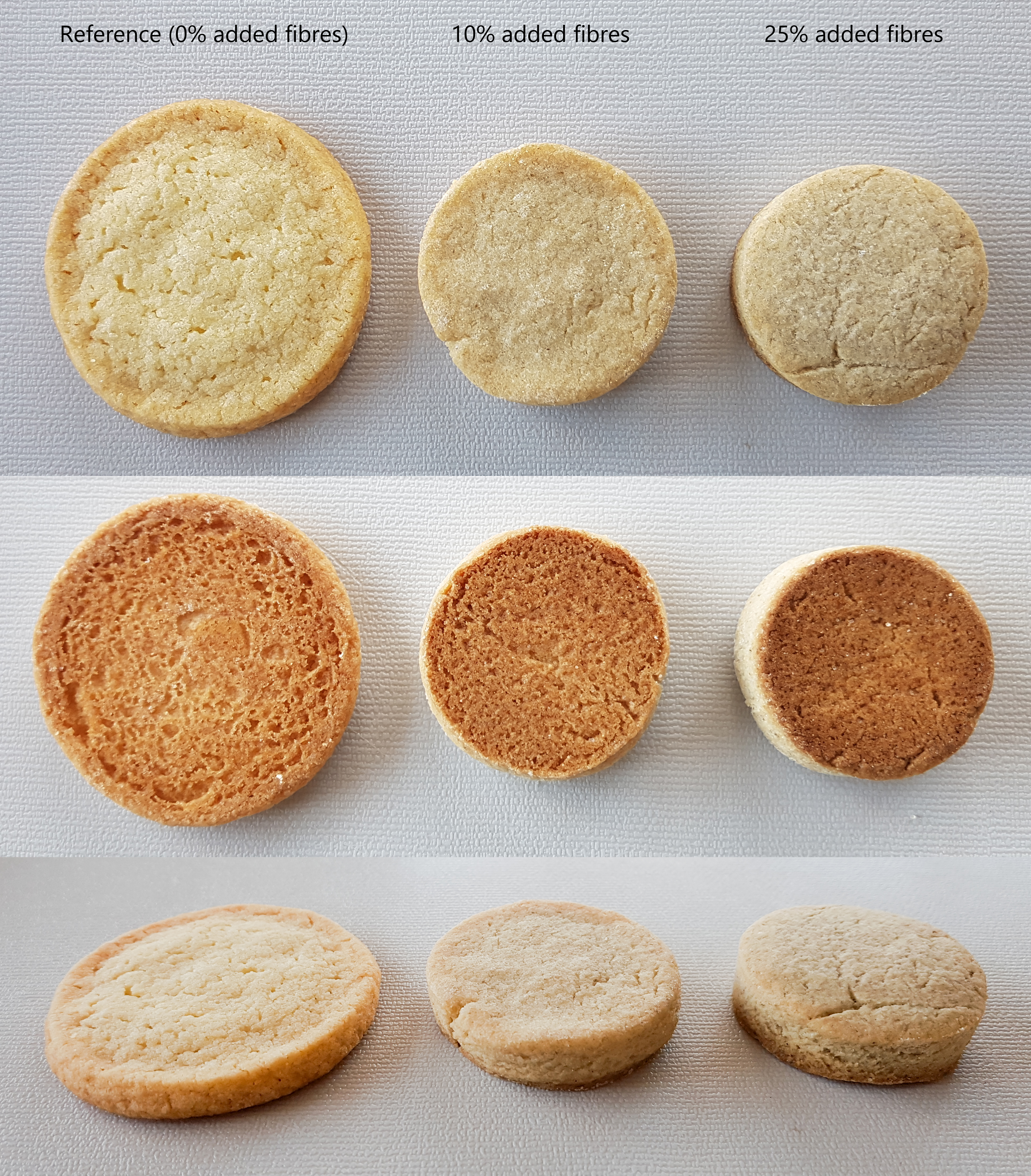 Het koekje dat 25% witlofvezels bevatte was zeer brokkelig en viel na het bakken gemakkelijk uit elkaar, bovendien vertoonde het ook veel scheuren en barsten. Het ongebakken deeg was zeer kruimelig waardoor het moeilijk was om het deeg uit te rollen en de koekjes te vormen. Door het hoge vezelgehalte hielden de koekjes wel beter hun oorspronkelijke vorm met als resultaat een minder breed en hoger koekje. Vergeleken met het referentiekoekje was er ook een verschil in kleur, waarbij de vezelrijke koekjes bleker waren dan de referentiekoekjes. De koekjes met een toevoeging van 10% vezels vormden mooi de overgang tussen de referentiekoekjes en de koekjes met 25% witloofvezel. \n\nOp basis van deze resultaten werd besloten om het koekje in de sensorische studie te testen met 10% Belgisch witloofpoeder.\n
